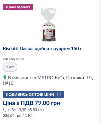 - "Metro" — паска "Biscotti" (150 г) 79 грн (100 г продукта ~52 грн);