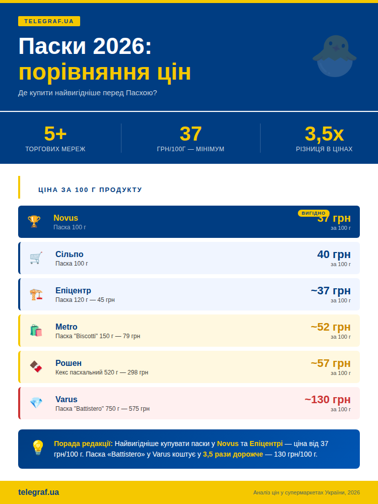 Дешевле всего на данный момент 100 г паски обойдется в супермаркетах "Novus" и "Эпицентр" — 37 гривен.