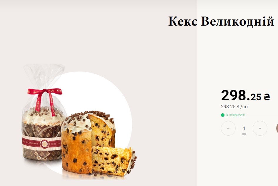 - "Рошен" — кекс пасхальній (520 г) 298 грн (100 г продукта ~57 грн);
