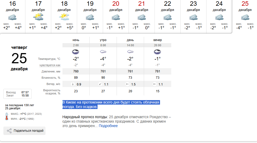 Этот прогноз подтверждают и на сайте Sinoptik. В ближайшие 10 день в Киеве сильных морозов не ожидается, с 21 декабря температура будет в диапазоне (0..-1 градус). В четверг, 25 декабря, в столице Украины на протяжении всего дня сохранится облачная погода, без осадков.