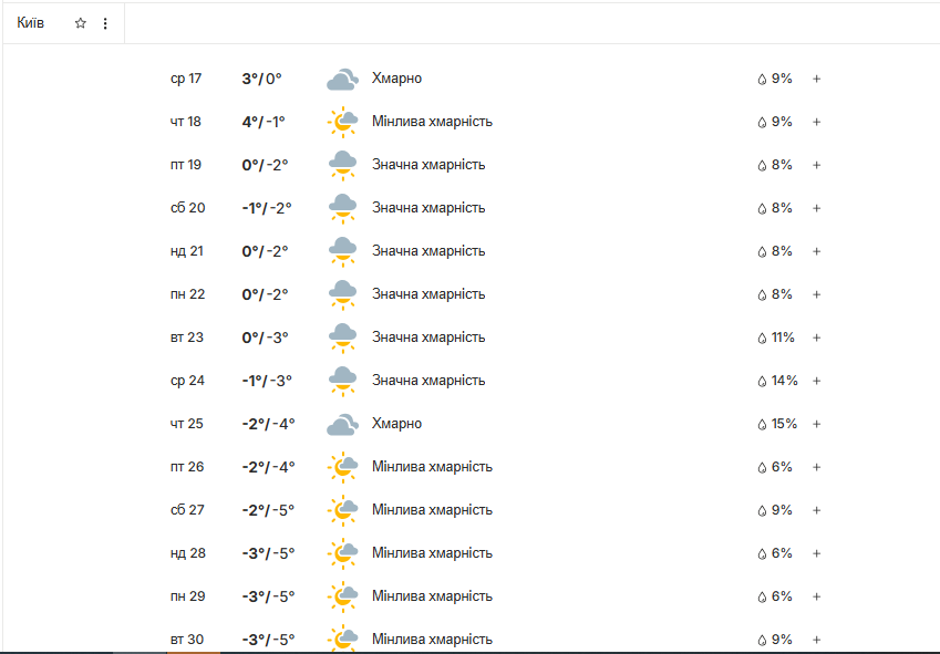Похожу картину прогнозируют и на сайте Weather. В ближайшие дни киевлян ожидает переменная облачность, вероятность осадков низкая. На Рождество, 25 декабря, будет облачно, температура ночью составит — 4 градуса, а днем столбики термометра покажут -2 градуса, ветер северо-восточный.