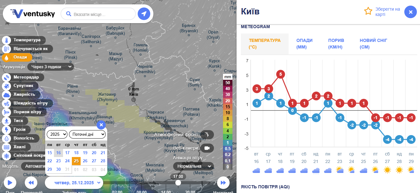 Согласно данным сайта Ventusky, в четверг, 25 декабря, в столице Украины не будет ни снега, ни дождей. Температура воздуха днем составит -2 градуса.
