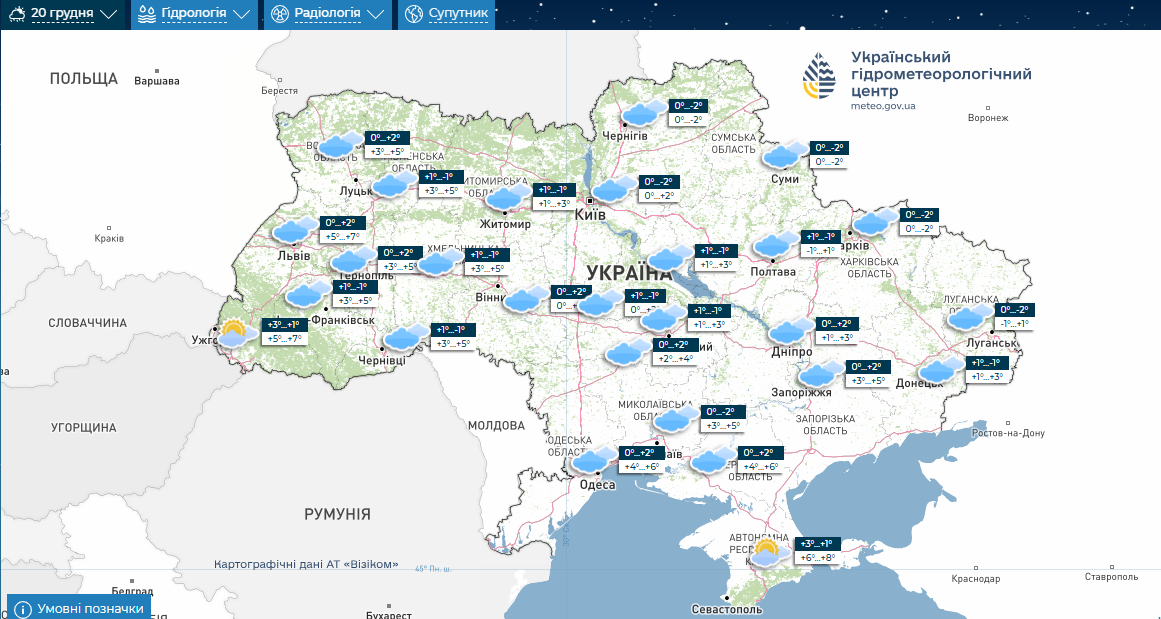 В субботу, 20 декабря, по всей территории Украины будет облачно, но без осадков. В Харьковской, Сумской и Черниговской областях днем столбики термометра покажут 0…-2 градуса, а в остальных регионах будет плюсовая температура. Ночью и утром Украину может накрыть сильный туман.