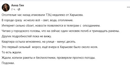 Писатель и блогер Анна Гин на своей странице в Facebook пишет, что в Харькове сразу после атаки пропали свет, вода и отопление. Дома в минусовую погоду на улице сразу же стало холодно.