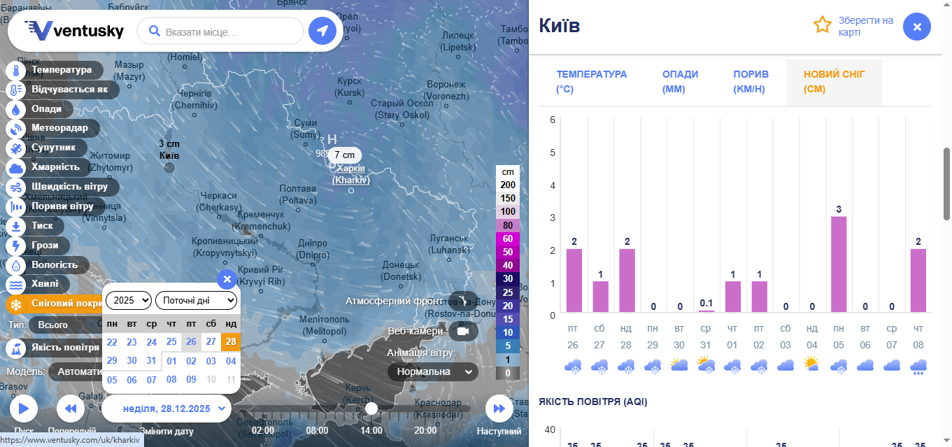 Как сообщает сайт Ventusky, в столице Украины 27 декабря ожидается небольшой снег, который продолжится и в воскресенье. Высота снежного покрова составит 3 см. На востоке страны осадки будут более обильные.