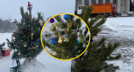 В результате в соцсети опубликовали фото на скорую руку установленной елки на центральные площади, с призывом присоединиться к ее украшению.