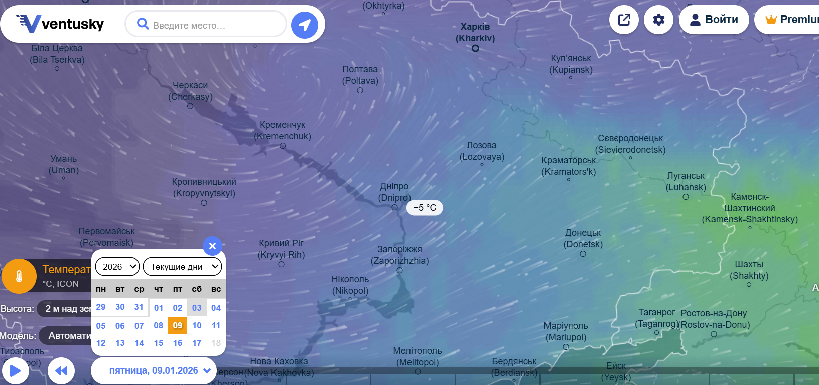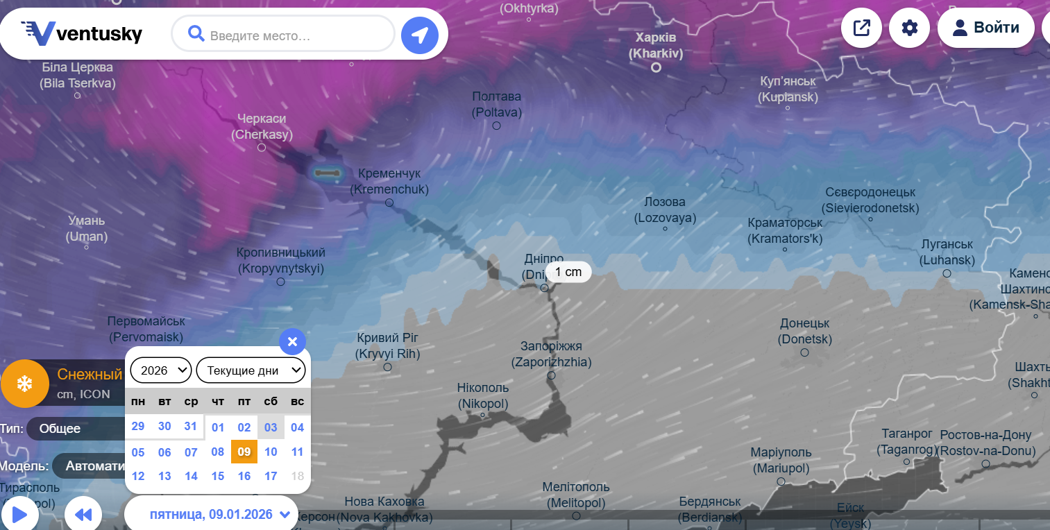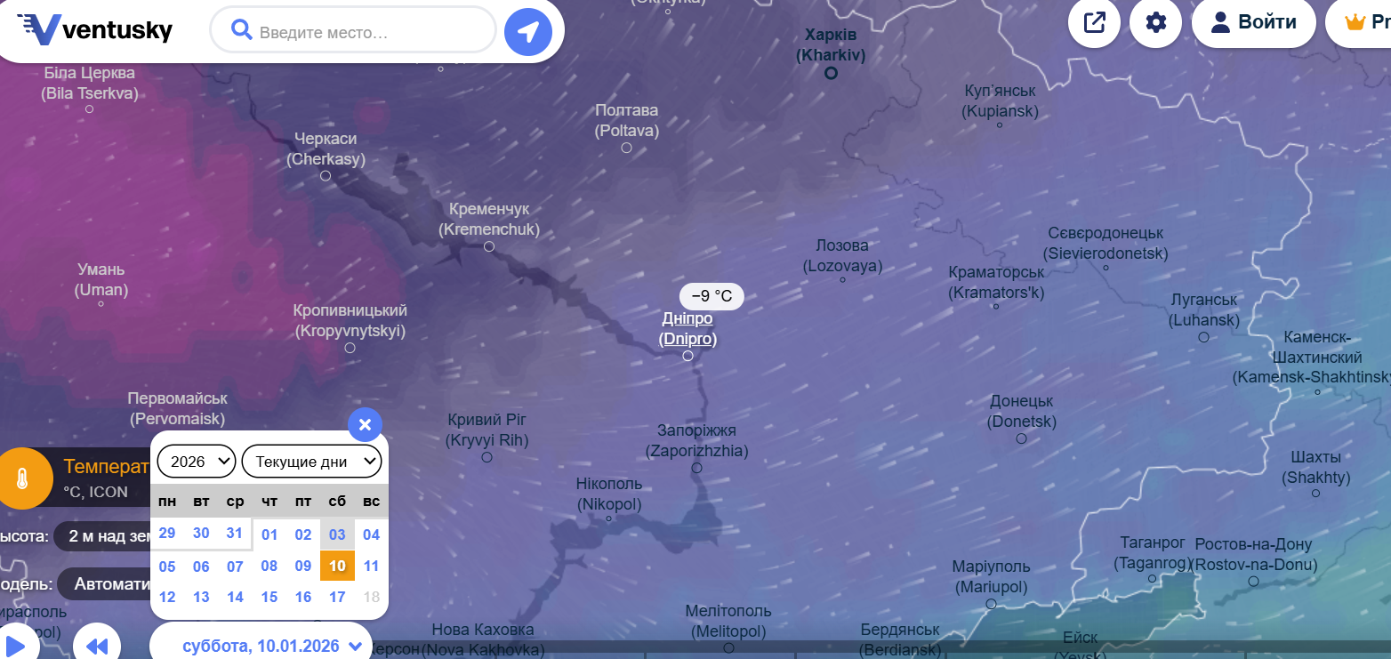 В Днепре после праздников ожидается заметное похолодание, и с 9 января жителям следует готовиться к сильному морозу. По прогнозам, температура воздуха начнет опускаться ниже нуля уже в эту пятницу, 9 января, с ночными минимумами около -5…-8 °C, а днем также прохладно с небольшим снегом или ледяным дождем, по данным Ventusky.