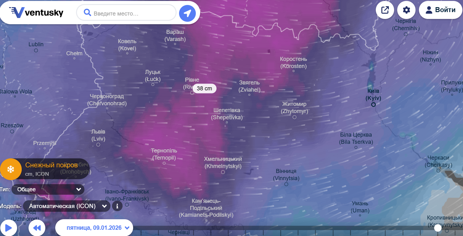 По данным Ventusky, 9 января, в пятницу, в Ровно снежный покров может достигать около 38 см, а воздух ночью и днем будет охлаждаться до -9 °C. Уже 10 января температура поднимется до -3°C, однако в воскресенье, 11 января, можно ожидать -14°C. Кое-где западные и северные области вообще могут увидеть значительный снег и метели в течение суток 9 января.