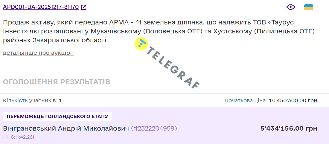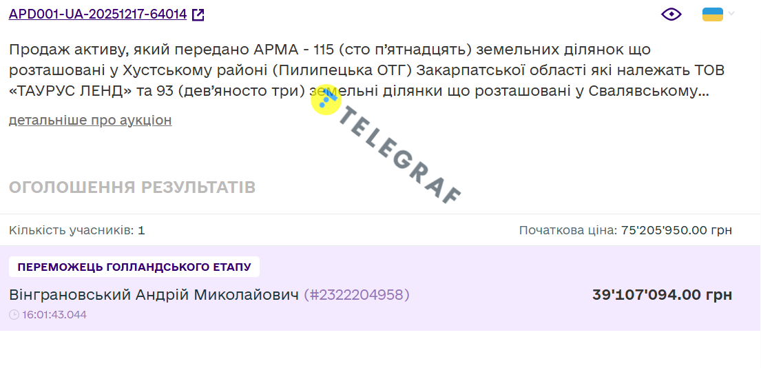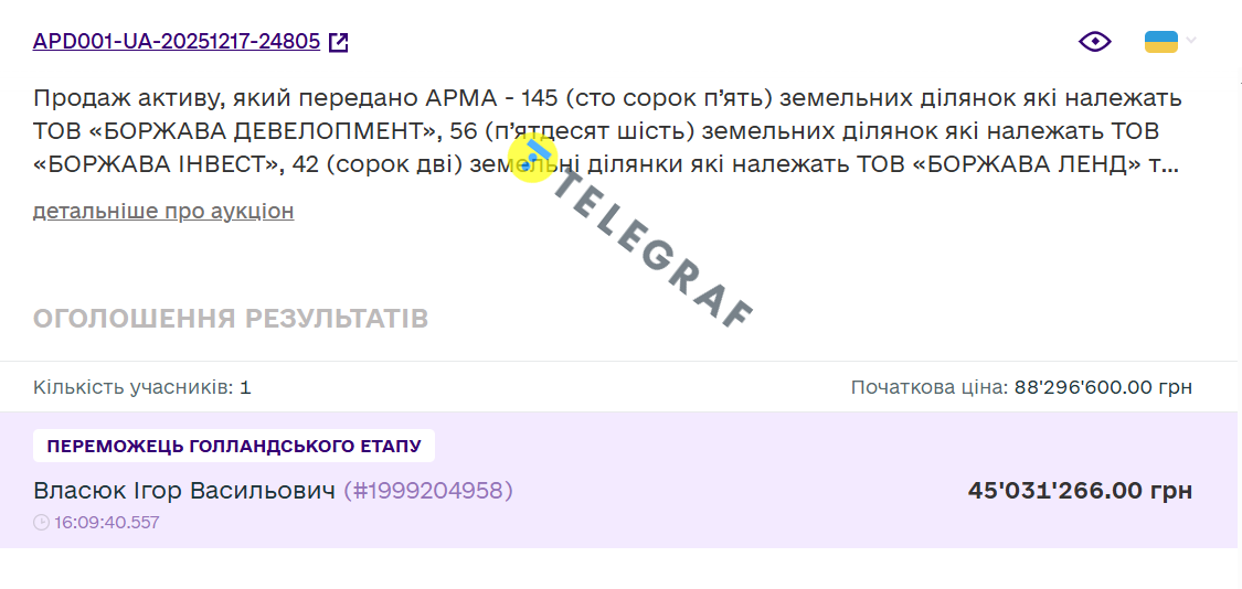 Так, участок площадью 26,7366 га был продан за 5,4 млн грн при начальной цене 10,4 млн грн, а 199,1488 га — за 39,1 млн грн вместо стартовых 75,2 млн грн. Оба лота приобрел Андрей Винграновский. Третий участок площадью 234,77 га достался Игорю Власюку за 45 млн грн при стартовой цене 88,2 млн грн. В результате средняя цена одной сотки земли составила около 2 тыс. грн.