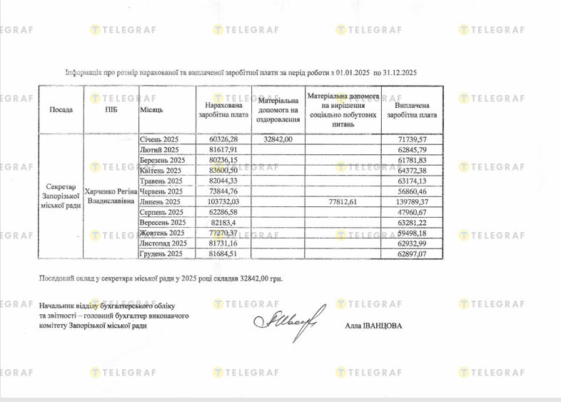В ответ на запрос Телеграфа в Запорожском городском совете сообщили, что должностной оклад в 2025 году составил 32 842 грн в месяц. Однако суммы выплат за месяц превышали его иногда более чем вдвое. В течение года начисления колебались от 60 до 100 тысяч гривен в месяц, в зависимости от премий и дополнительных выплат. Самая большая сумма была зафиксирована в июле — более 139 тыс. грн суммарно.