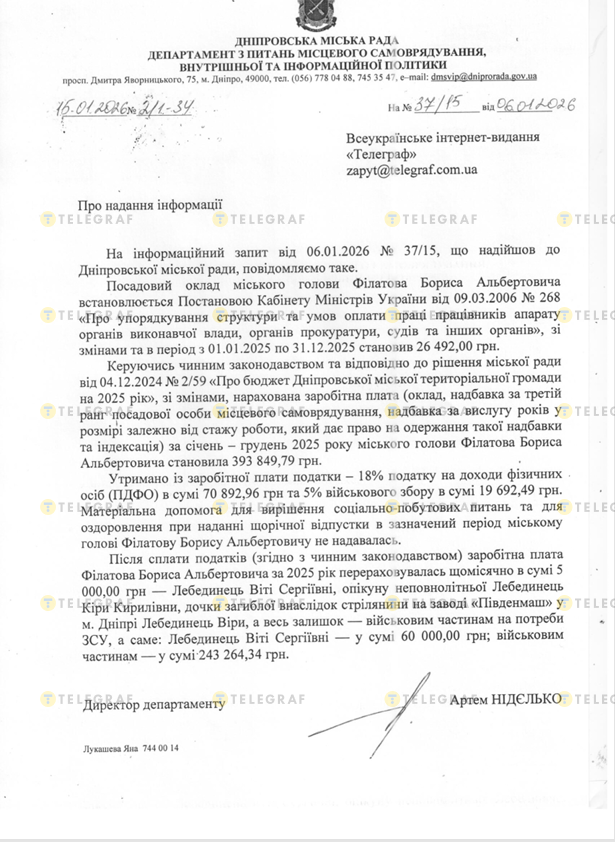В Днепровском горсовете обнародовали подробные данные о доходах городского головы в ответ на информационный запрос "Телеграфа". В них отмечено, что с учетом надбавки за третий ранг должностного лица местного самоуправления, надбавки за выслугу лет и индексации за январь — декабрь 2025 года общая сумма начисленной заработной платы Бориса Филатова составила 393 849,79 грн.