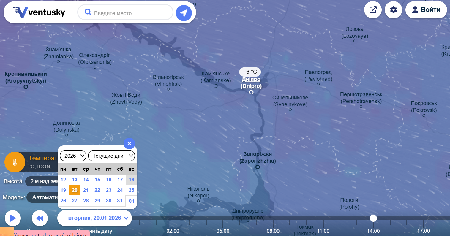 Погода в Днепре на 20 января. Фото: ventusky