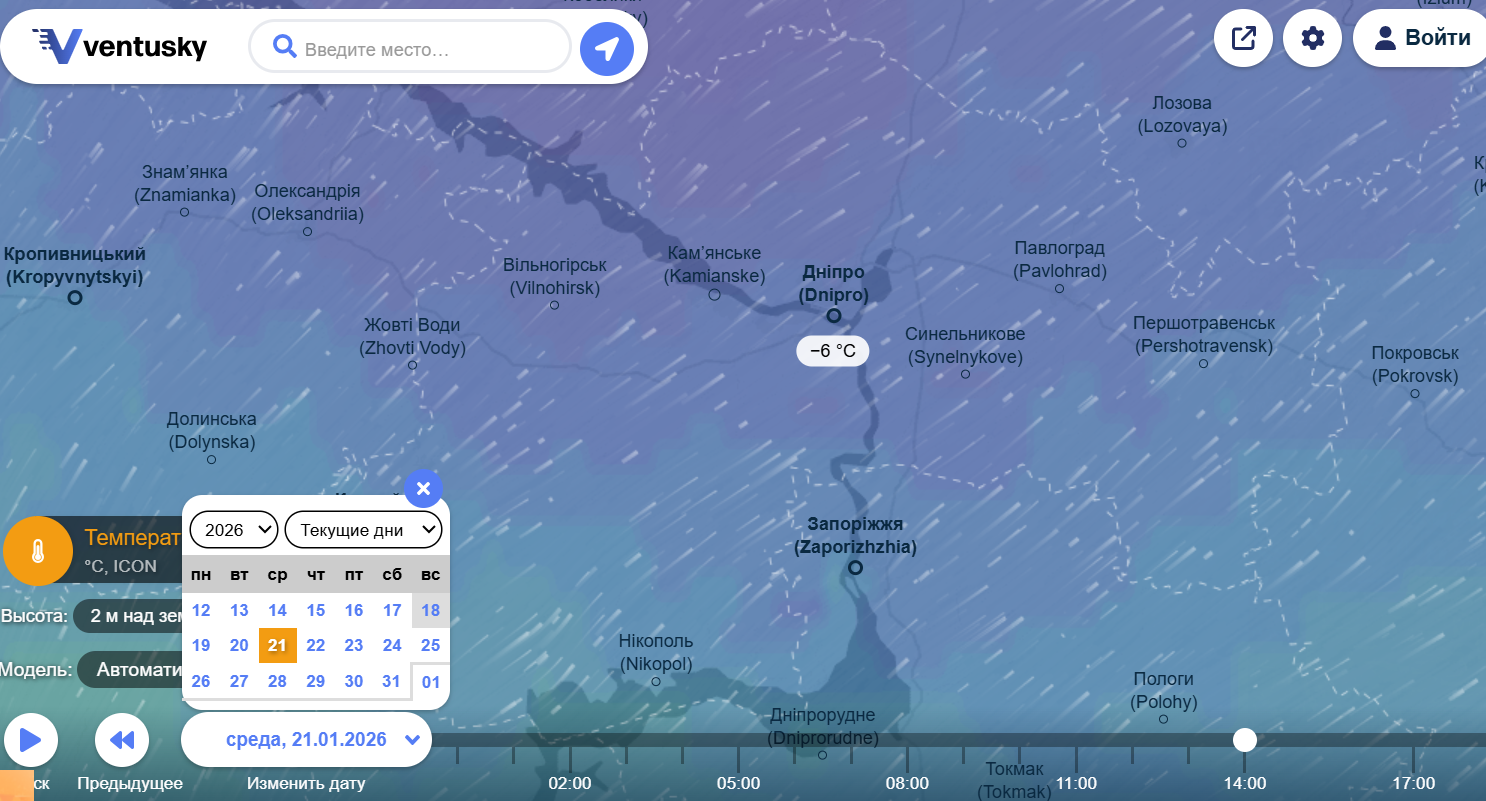 Погода в Днепре на 21 января. Фото: ventusky
