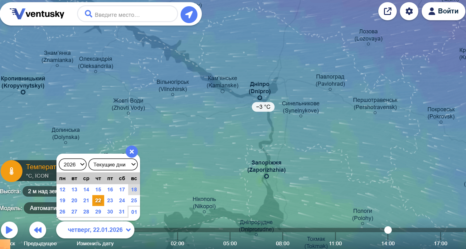 Погода в Днепре на 22 января. Фото: ventusky