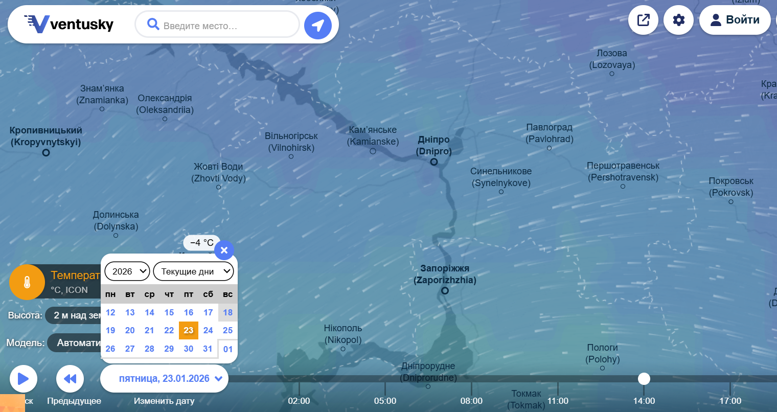 Погода в Днепре на 23 января. Фото: ventusky