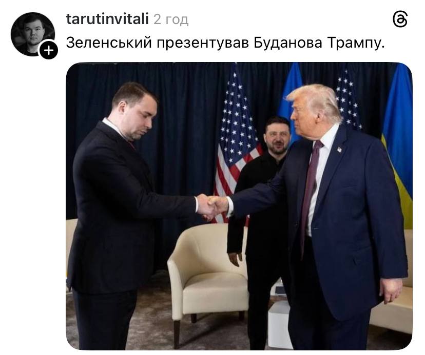 На этом обсуждаемом кадре Буданов жмет руку Дональду Трампу, склоняя голову и закрыв глаза. А на заднем плане виден улыбающийся президент Украины Владимир Зеленский.