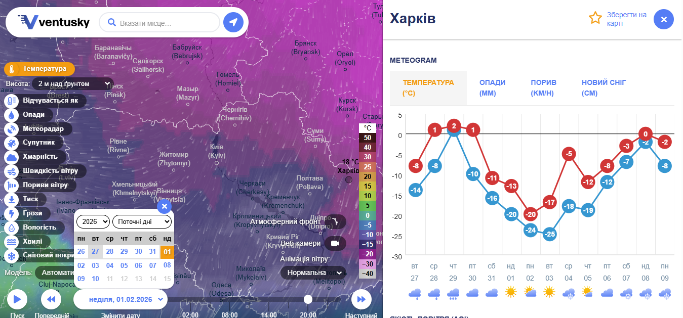 Согласно данным Ventusky, начало февраля принесет в Харьков сильные морозы. В ночь на 1 февраля температура опустится до -20 градусов, а днем столбики термометра покажут -13.
