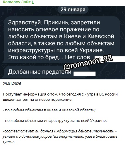 Информацию о перемирии распространил основатель спецподразделения "KRAKEN" Константин Немичев. По его словам, энергетическое перемирие, вероятно, могло наступить с сегодняшнего дня, 29 января.