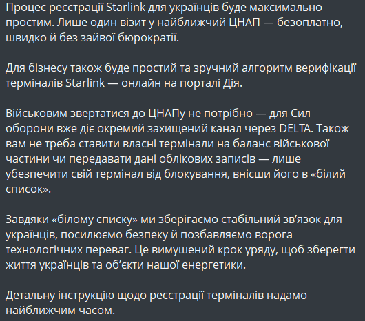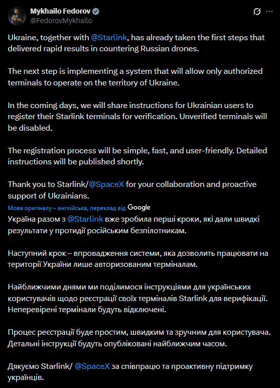 Отдельно он анонсировал следующий этап — внедрение системы, которая позволит работать на территории Украины только авторизованным терминалам Starlink. Процесс регистрации, заверил министр, будет простым и быстрым.