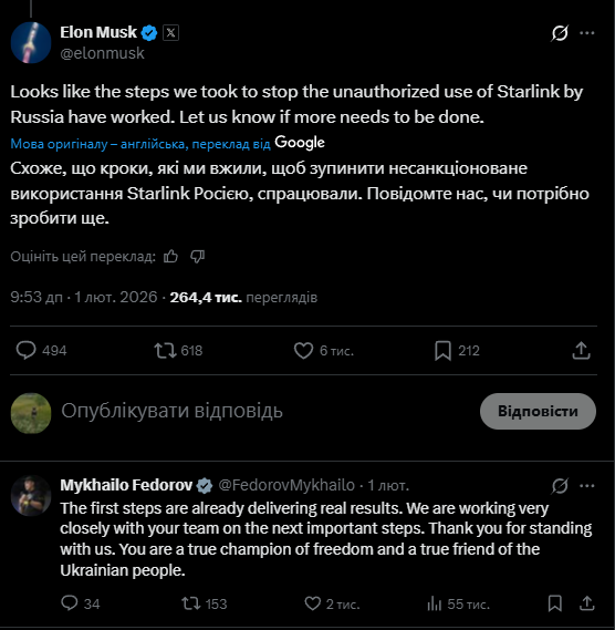 В следующем сообщении Федоров поблагодарил Маска за поддержку и подчеркнул практический результат сотрудничества. "Благодаря первым шагам, сделанным в последние дни, ни один украинец не погиб от российских дронов с использованием Starlink — и это бесценно", — отметил он, добавив, что работа с командой SpaceX над дальнейшими решениями продолжается.