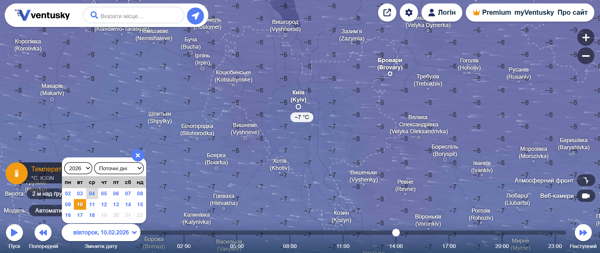 Погода в Киеве на 10 февраля. Фото: ventusky