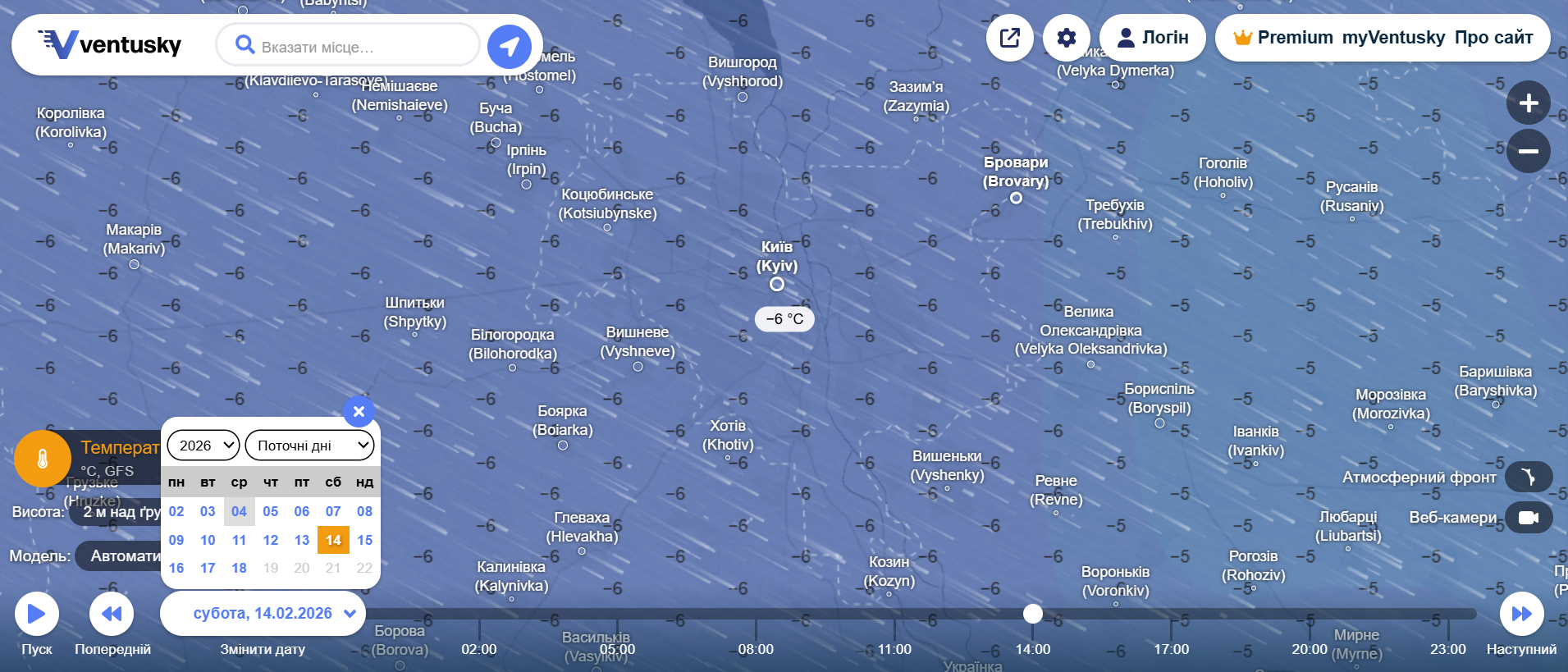 Погода в Киеве на 14 февраля. Фото: ventusky