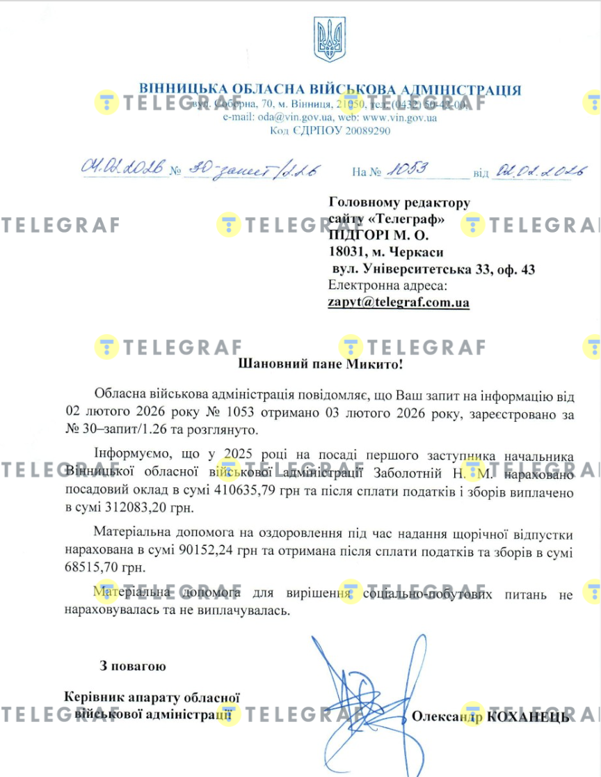 Согласно документу первая заместительница за 2025 год заработала 410 635,79 грн. Однако после уплаты налогов на руки получила всего 312 083,20 грн. То есть по 26 тысяч гривен в месяц. При этом Заболотный насчитали материальную помощь от государства на оздоровление при предоставлении ежегодного отпуска на сумму 90 152,24 грн. После уплаты налогов и сборов на руки чиновник получила 68 515,70 грн.