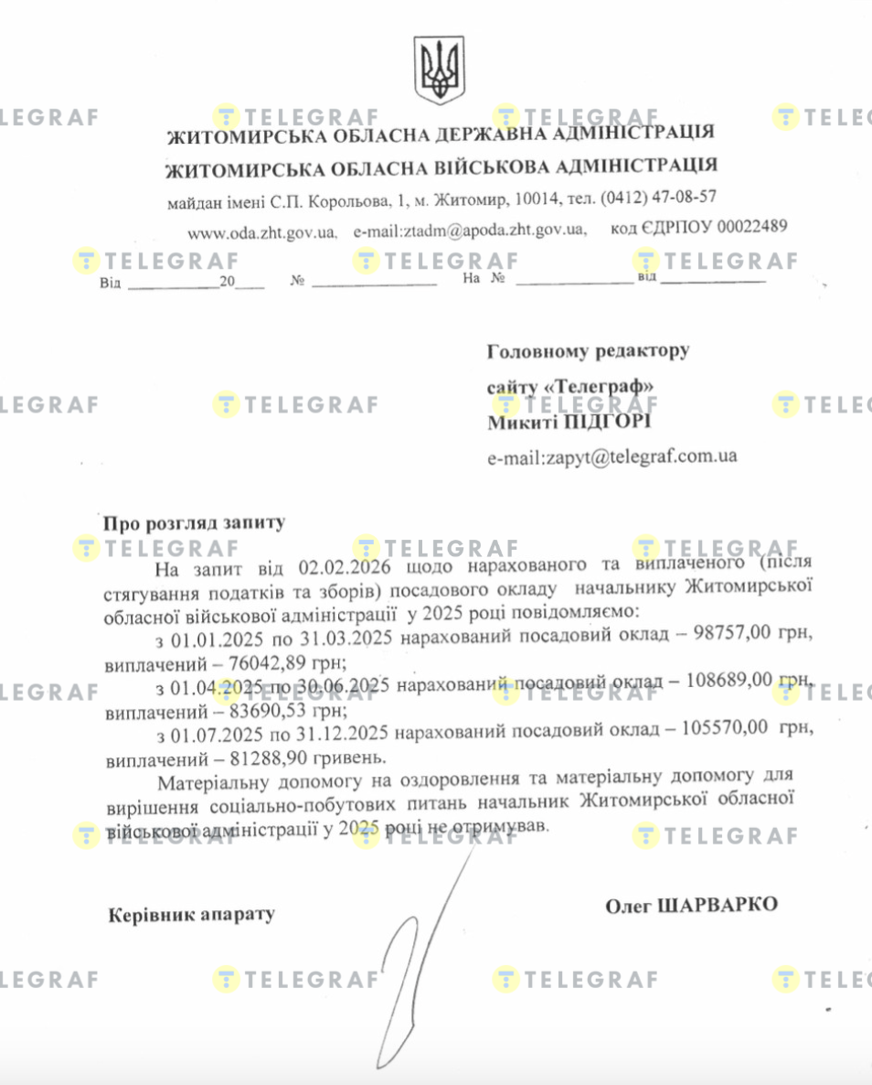 Как сообщили в Житомирской областной государственной администрации на запрос "Телеграфа", Бунечко в 2025 году не получал материальную помощь на оздоровление или для решения социально-бытовых вопросов.