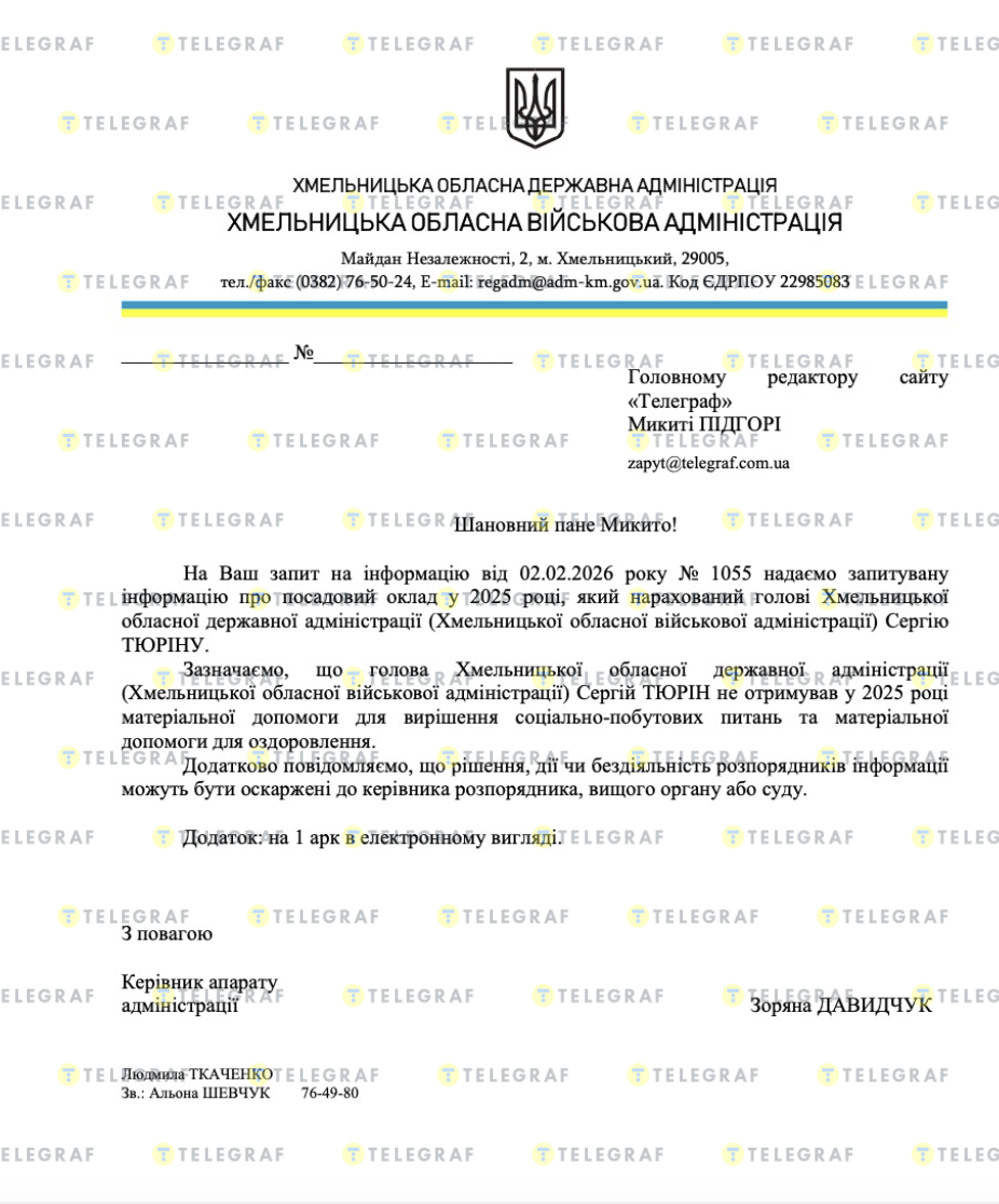 Об этом по запросу "Телеграфу" сообщили в Хмельницкой ОГА. Отметив, что Тюрин не получал в 2025 году материальную помощь для решения социально-бытовых вопросов и материальную помощь для оздоровления.