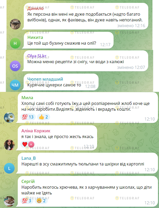 "Наконец-то в зсу будут жарить тюльпаны и шкурки от картофеля", "Можно меню рецепты из снега или воды из лужи", — пишут комментаторы, но некоторые все же считают его специалистом своего дела.