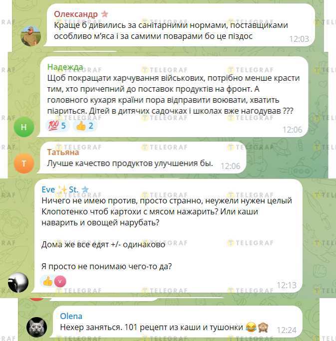 Однако большая часть корреспондентов отмечает – проблема не в рецептах, а в поставках. "Чтобы улучшить питание военных, нужно меньше воровать тем, кто причастен к поставкам продуктов на фронт. А главного повара страны пора отправить воевать, хватит пиариться. Детей в детских садах и школах уже накормил???", — пишет Надежда. "Ничего не имею против, просто странно, неужели нужен целый Клопотенко, чтобы картошки с мясом нажарить? Или каши наварить и овощей нарезать?", — отмечает другой автор.