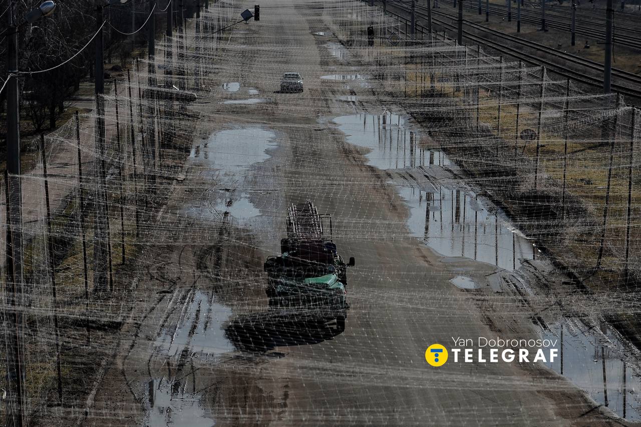 В городе до сих пор остаются люди, хотя улицы в основном пустые. Многоэтажек и частных домов, частично или полностью разрушенных, с каждым днем становится больше. На дорогах воронки от снарядов, обломки и антидроновая сетка для защиты передвижения.
