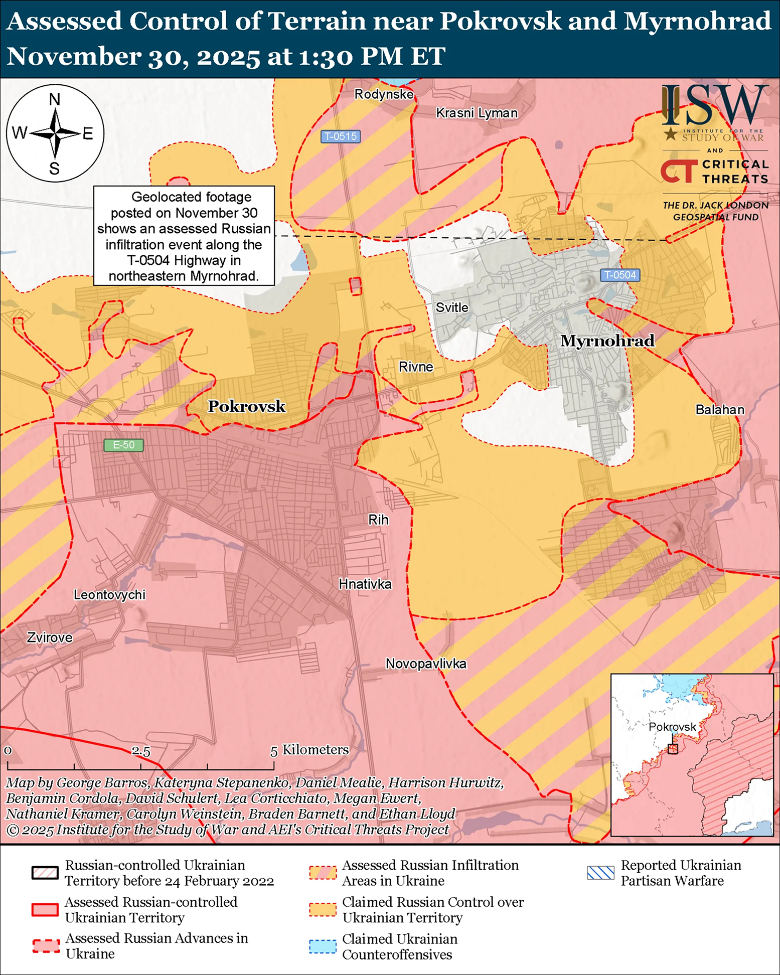 О взятии Покровской и Волчанской россияне заявили 30.11 перед визитом в Кремль американских представителей Стива Уиткоффа и Джареда Кушнера. Но текущая ситуация была другой. На 30 ноября, несмотря на то, что российские подразделения удерживали позиции в Покровске более 120 дней, им так и не удалось полностью установить контроль над городом. Герасимов заявлял о захвате более 80% Волчанской и более 75% Покровской, однако, по оценкам ISW, подтвержденные данные свидетельствуют лишь о контроле над примерно 34% Волчанска и 46% Покровска.
