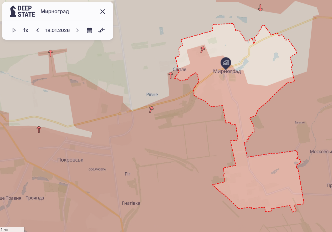 Карта боевых действий в Мирнограде 18 января 2026/DeepStateMap
