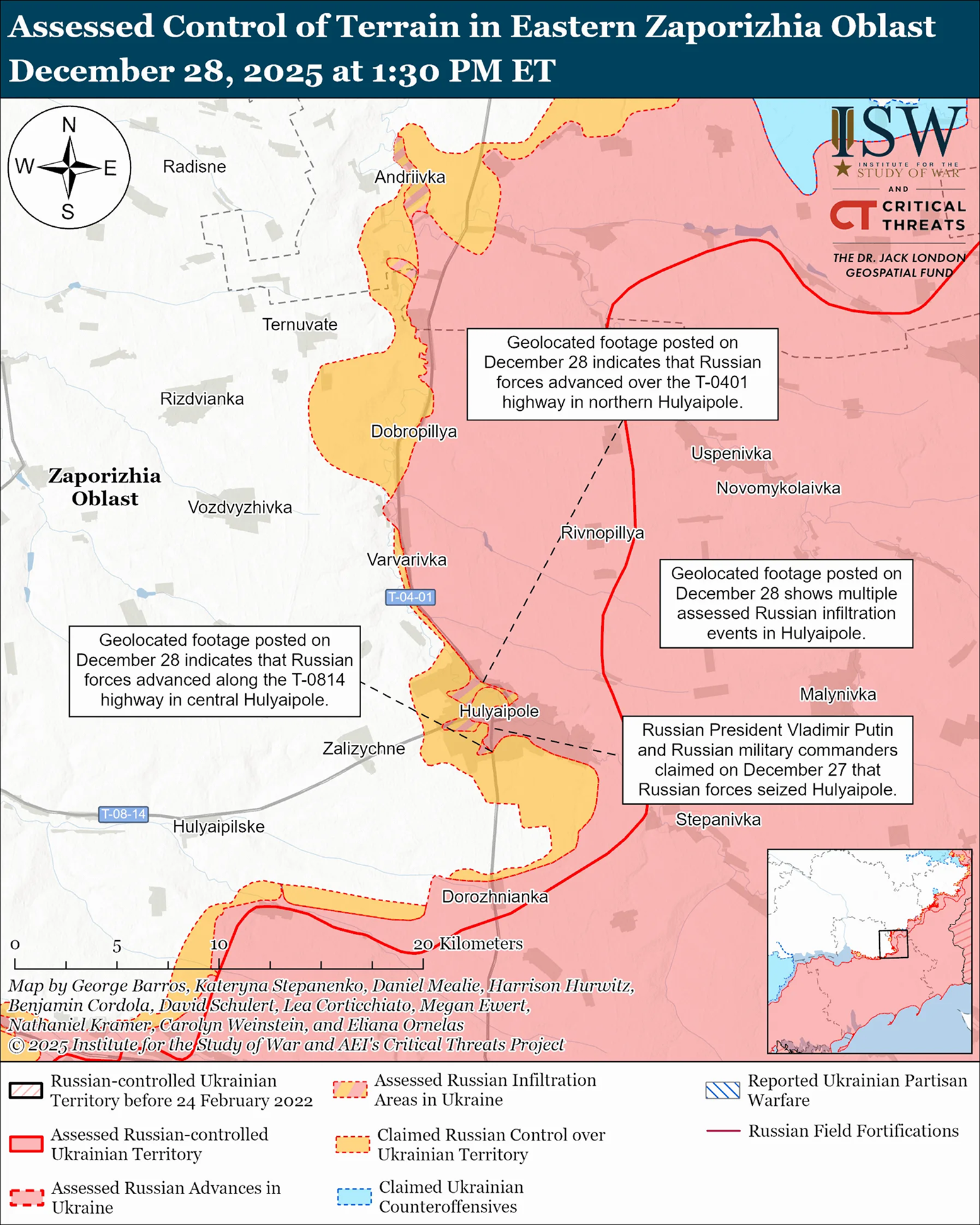 В преддверии Нового года перед встречей Дональда Трампа и Владимира Зеленского Россия заявила о взятии Гуляйполя и Мирнограда. Согласно анализу ISW, российские войска в то время действовали менее чем в половине Мирнограда и примерно у 55% Гуляйполя. Большая часть населённых пунктов была серой зоной.