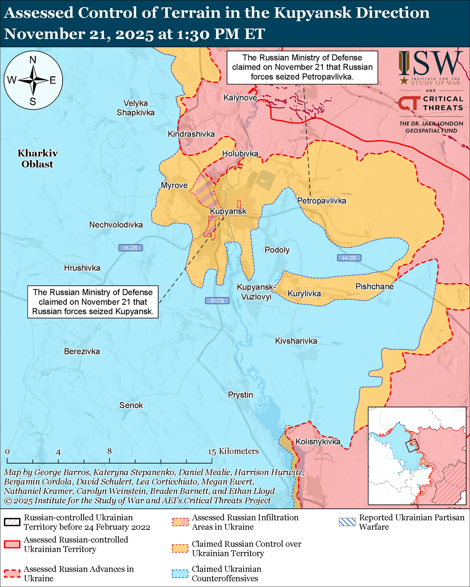 Карта боевых действий в Купянске 21 ноября 2025 года/ISW