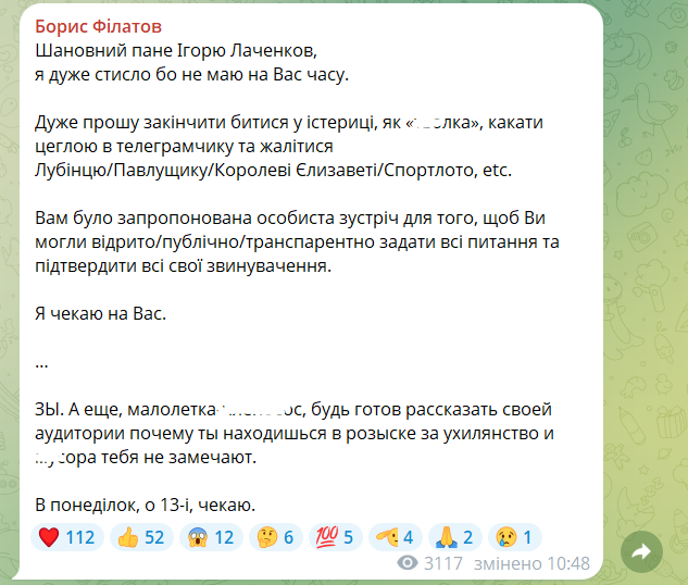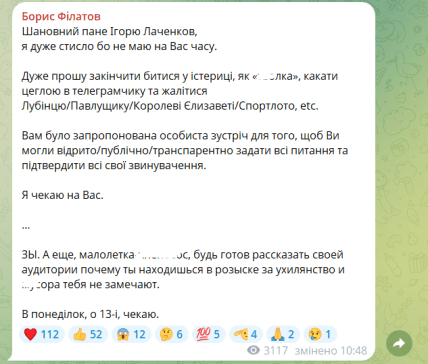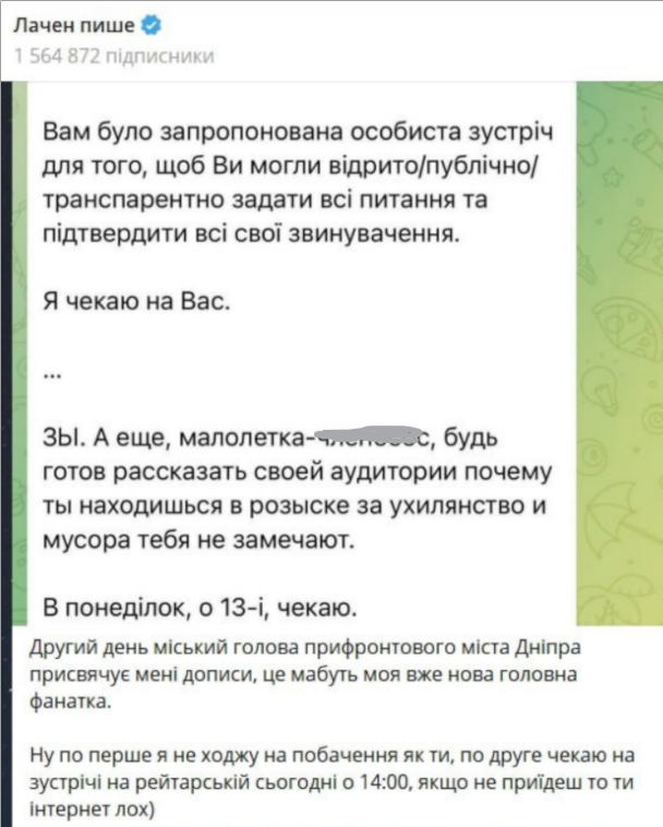Обновлено. Филатов сделал еще одну публикацию, в которой повторил свое приглашение Лаченкову. Хотя первая часть обращения написана на украинском, в ней также немало образ в сторону блогера. Мэр Днепра просит Лачена "закончить биться в истерике, как "т**лка", и жаловаться.