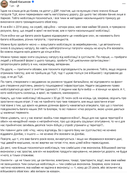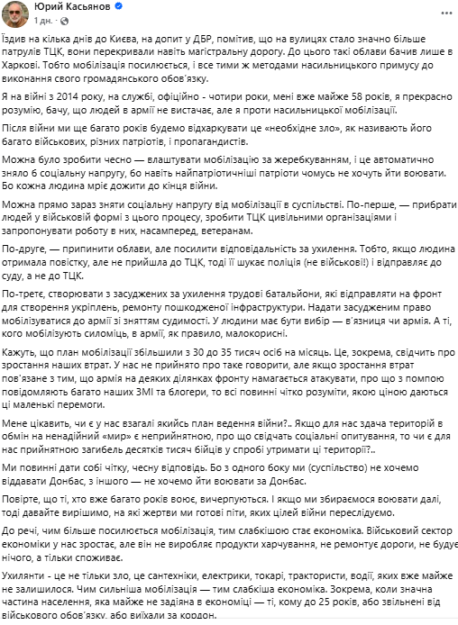 Также Юрий Касьянов, офицер ВСУ, радиоинженер, специалист по аэроразведке, основатель общественного опытно-конструкторского бюро беспилотной авиации "Matrix-UAV" рассказал, что на улицах Киева стало гораздо больше патрулей ТЦК, они перекрывали даже магистральную дорогу.