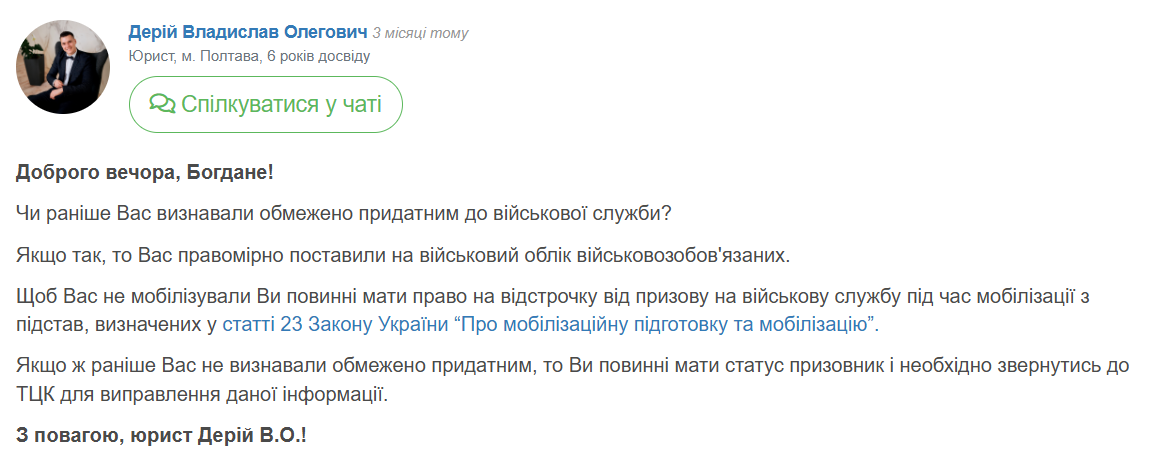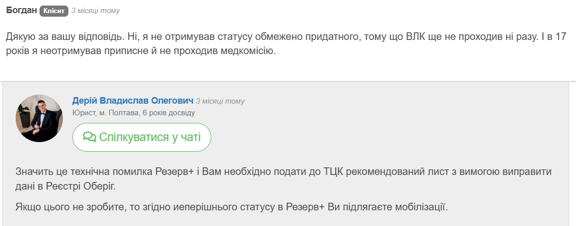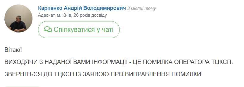 "Исходя из предоставленной вами информации — это ошибка оператора ТЦК. Обратитесь в ТЦК и СП с заявлением об исправлении ошибки", — отметил он.