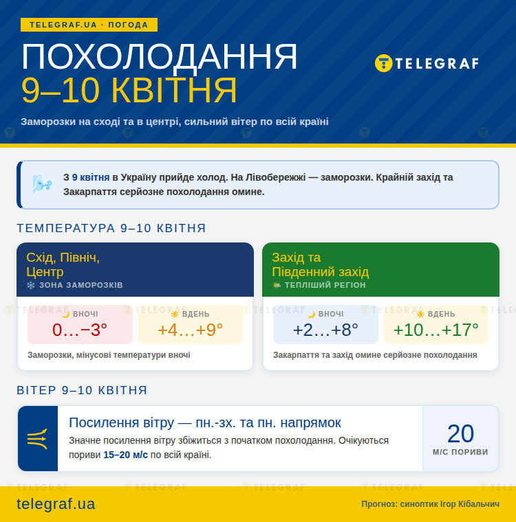 Согласно его прогнозу, 9 и 10 апреля на востоке, севере и в центре Украины ожидаются заморозки при температуре 0…-3 °C. Днем температура не поднимется сильно — прогнозируется +4…+9°C. Запад и юго-запад Украины будет теплее — ночью +2…+8 °С, днем ​​+10…+17 °С.