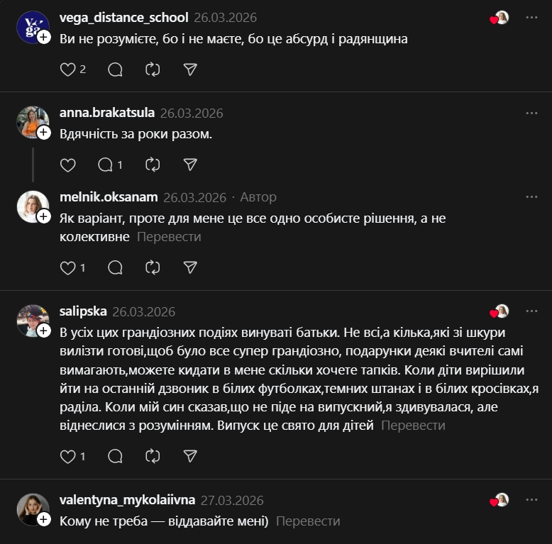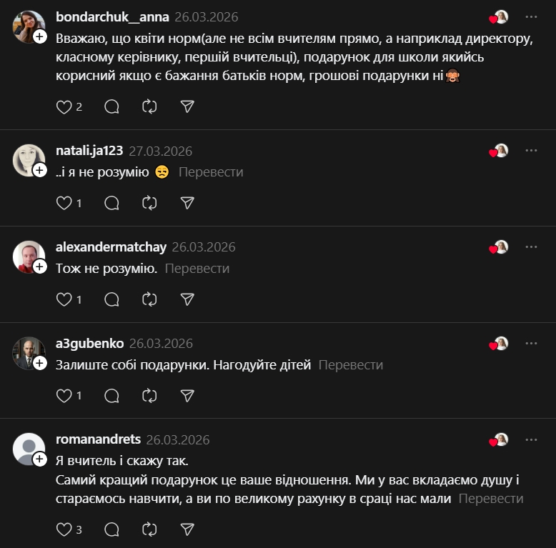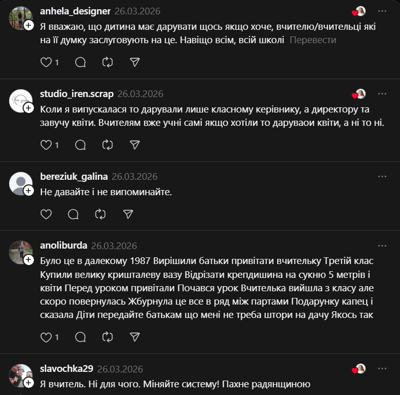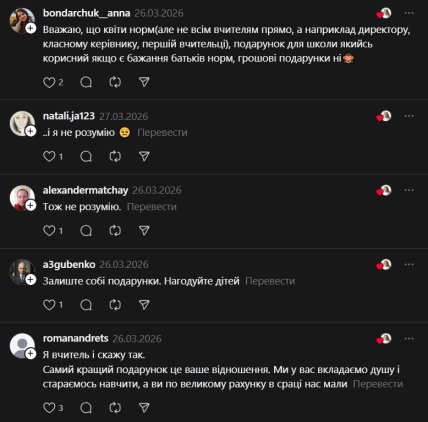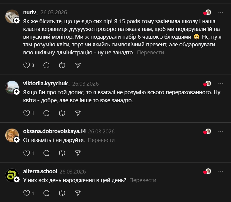 Большинство участников обсуждения едины в одном: подарки директору и завучам – это уже перебор. "Классному руководителю еще можно понять, но когда нам учитель написала, что нужно завучам и директору по букету — мы все выпали. Добились того, чтобы только директору были", — пишет пользователь mrs_dementova в threads. Другая участница дискуссии рассказывает еще более яркий пример: