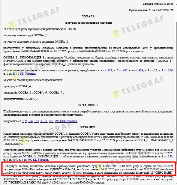В январе 2026 года Приморский суд Одессы разрешил это противоречие: меньший залог в 20,1 млн грн (вносило в октябре 2025 года ООО "Эвагрейн" и теперь получило обратно) отменил как избыточный, а оставил больший в 44 млн грн (заплатила частями группа компаний и лиц, среди которых в частности защитники президента-беглеца Виктора Януковича — Виталий Сердюк и Александр Бабиков).