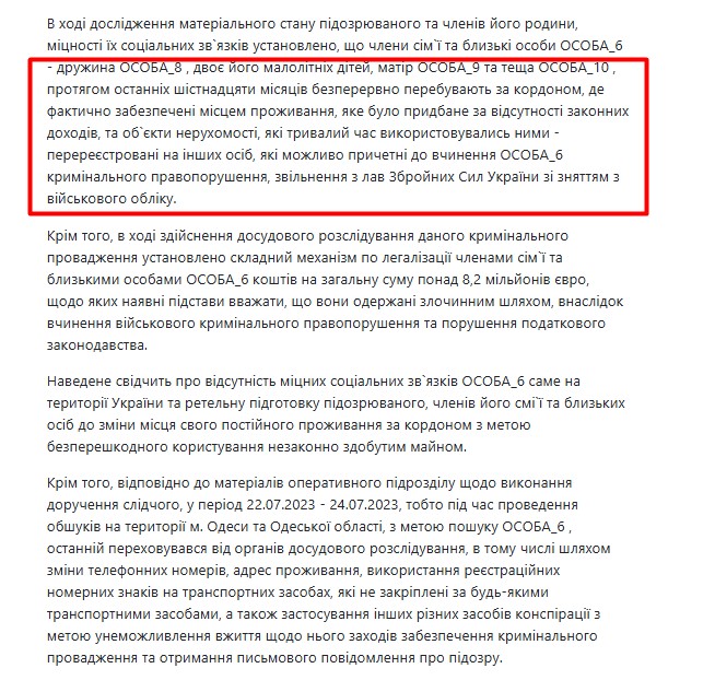 Владельцами имущества числились мать и свекровь экс-военкома, только офисное помещение оформлено на жену. Однако, по данным Нацагентства по предотвращению коррупции, их официальные доходы за десятки лет не покрывали значительную часть стоимости покупок. К тому же у обеих старших родственниц даже не было водительских удостоверений.