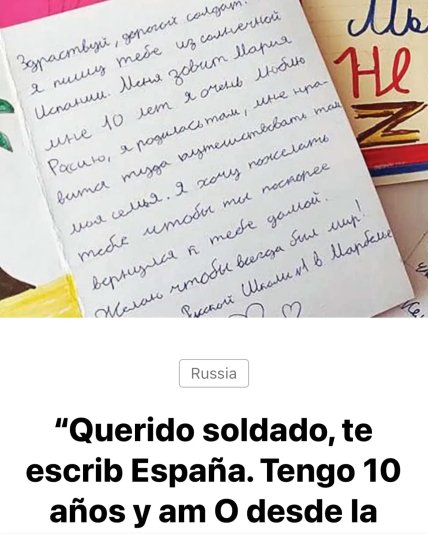 • детскую милитаризацию – Школы при посольствах/консульствах и даже частные учебные заведения работают по стандартным российским программам. Соответственно, здесь также проводят т.н. "Разговоры о важном", где детям навязывают кремлевскую идеологию. Учащихся приобщают к акции "Письмо солдату", что предполагает написание посланий в поддержку армии РФ, проводят творческие конкурсы "Россия — моя страна" и т.д.