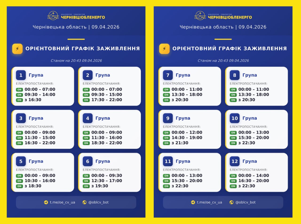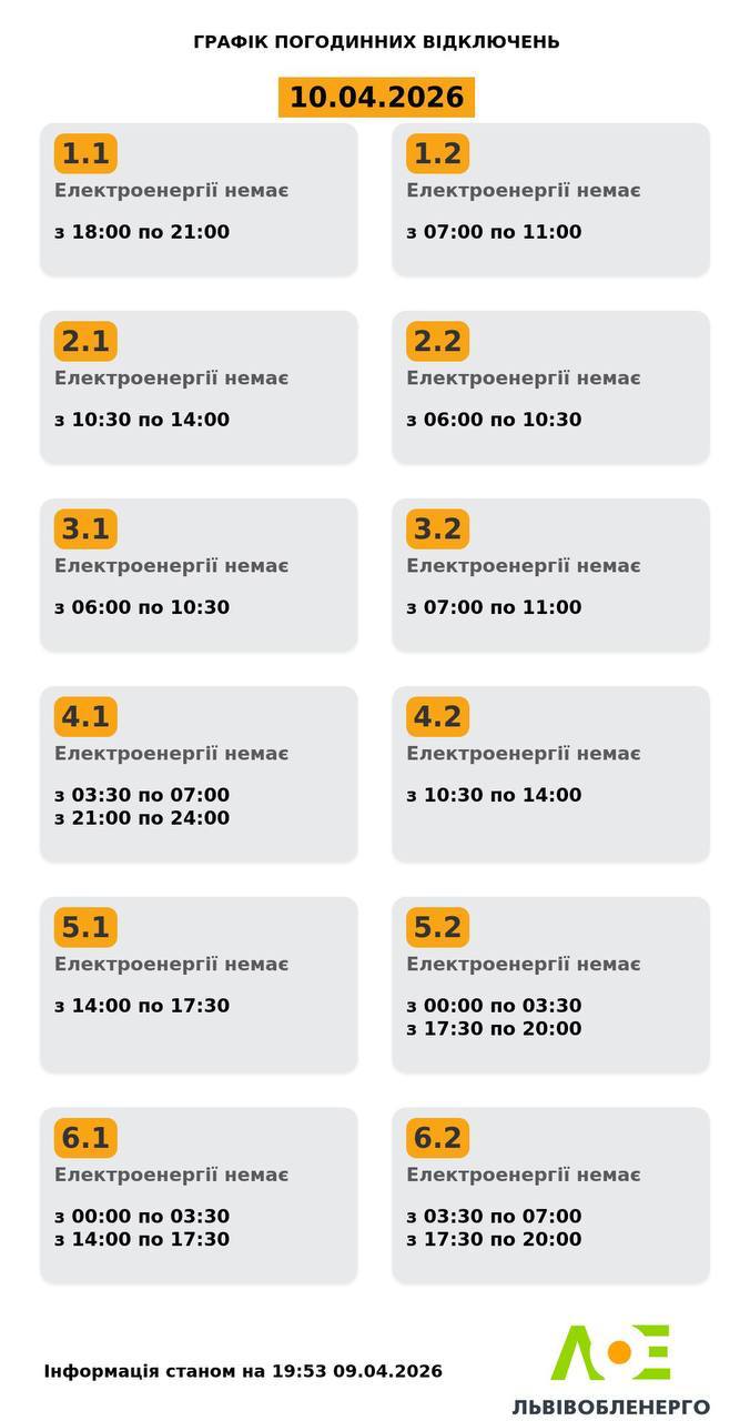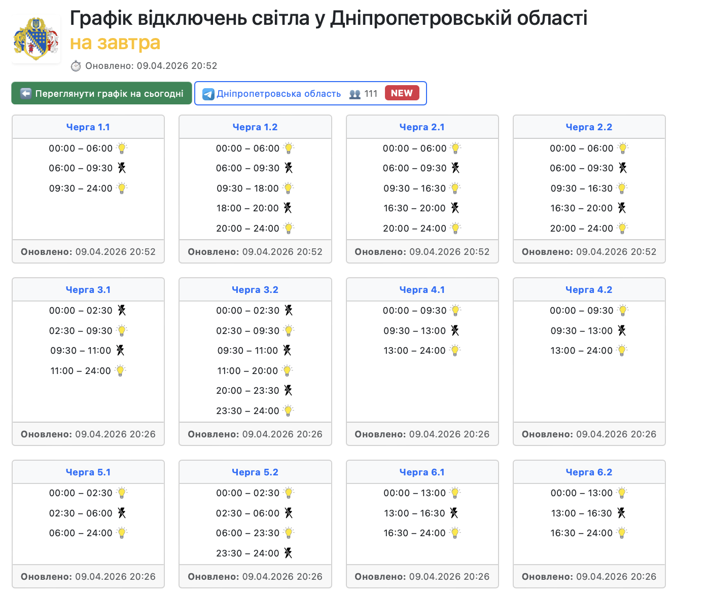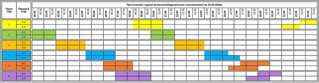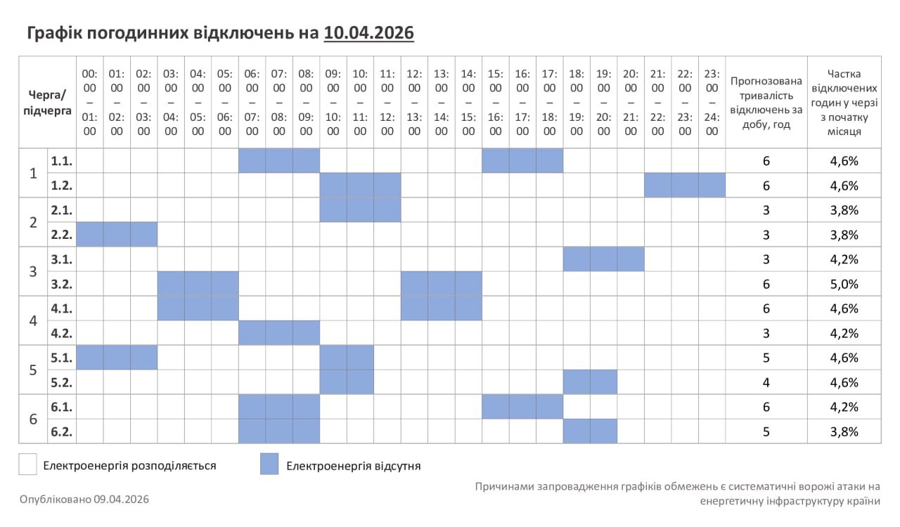 Из-за энергетического террора России украинцы вынуждены жить в условиях отключений света. В четверг, 10 апреля, в стране действуют отключения электричества для бытовых потребителей, сообщает "Укрэнерго"