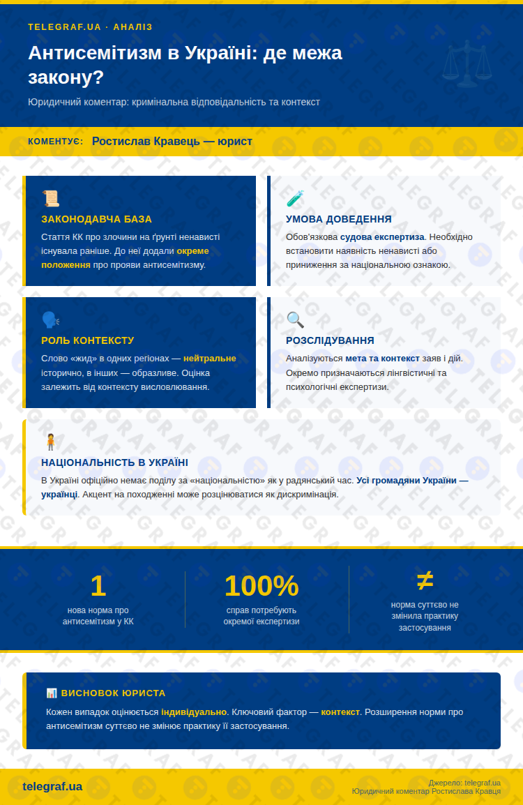 В Украине вступил в силу закон об уголовной ответственности за антисемитизм. При этом, в каждом конкретном случае важно учитывать обстоятельства и контекст, чтобы корректно оценить действия или высказывания.