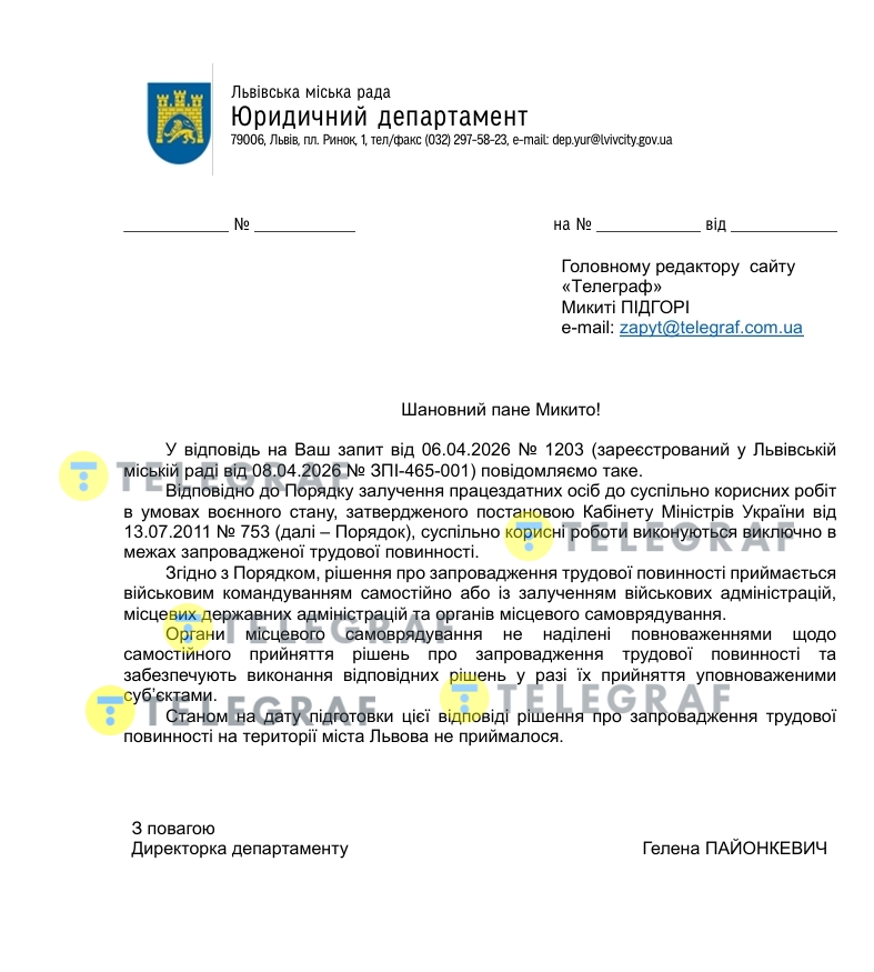 "По состоянию на дату подготовки этого ответа решение о введении трудовой повинности на территории города Львова не принималось", — говорится в документе.