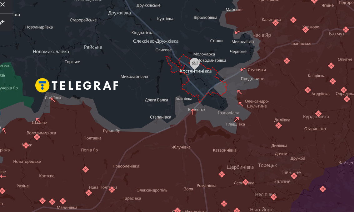 Эксперт отметил, что в районе Константиновки замечено фронтальное давление, проникновение малых штурмовых групп, а также бои в городской застройке. Они происходят также и в районах железнодорожной инфраструктуры. И это угроза дальнейшего продвижения прямо в районе жилой застройки. Кроме того сообщается о попытках давления с флангов.
