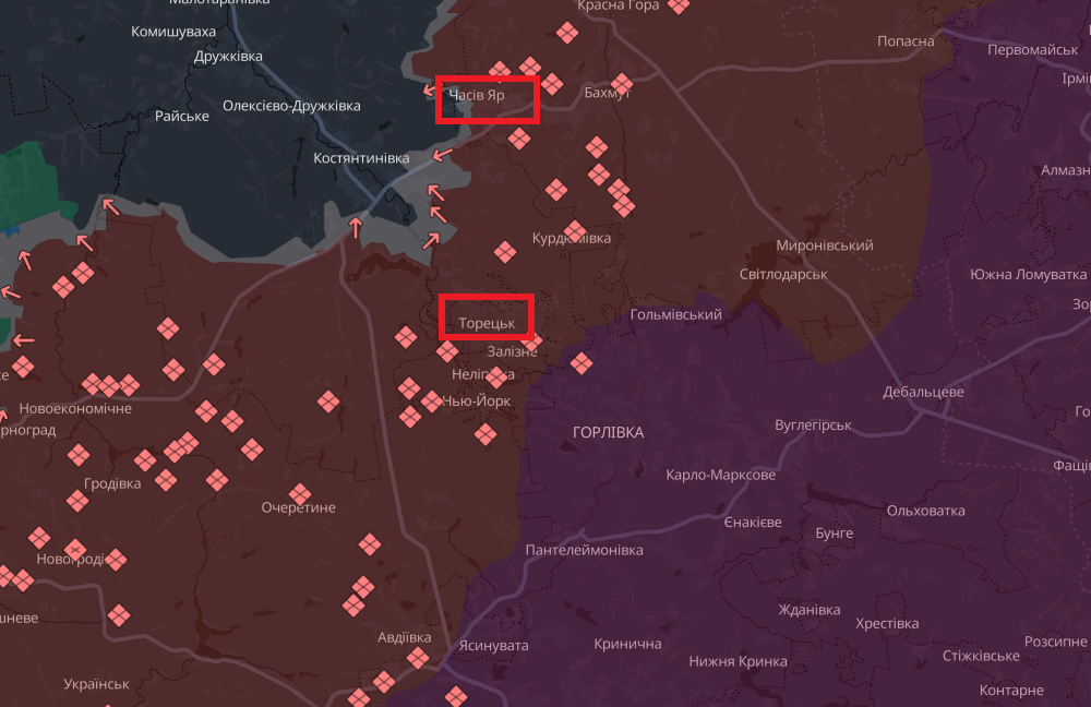Российские войска контролируют доминирующие высоты — Часов Яр и Торецк. Это делает для Украины невозможными ротацию личного состава, подвоз БК, вывоз раненых и т.д.