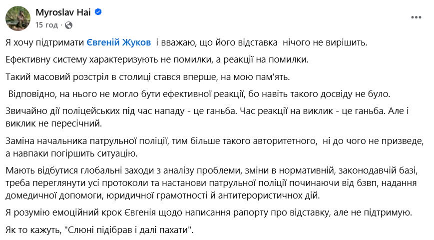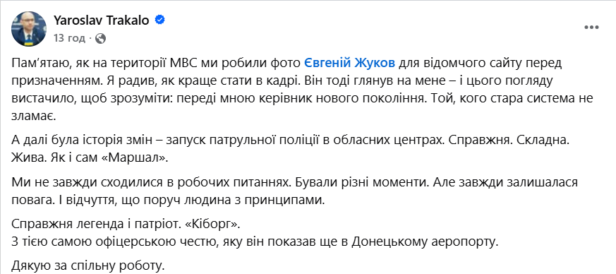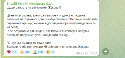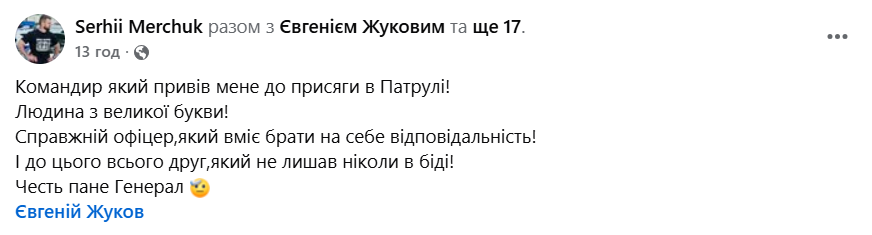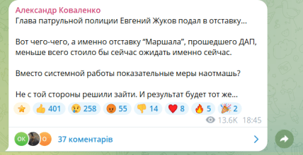 Известные украинцы поддерживают начальника департамента патрульной полиции Нацполиции Украины Евгения Жукова, который подал в отставку после теракта с погибшими в Киеве, и считают его решение ошибкой. В соцсетях возникла настоящая волна солидарности по отношению к Жукову, который еще со времен своего участия в боях за Донецкий аэропорт (2014-2015 годы) имеет псевдо "Маршал".